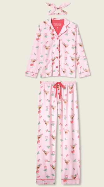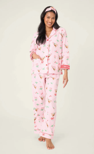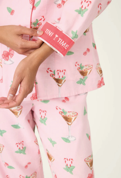 Festive and spirited, this three-piece flannel set is made from soft cotton in a classic twill weave, complete with a button-front top, relaxed drawstring pants, and a matching headband. The blush-pink backdrop is covered in candy cane martinis, mint sprigs, and cheery little bows, finished with contrast piping and a cuff that cheekily reads “Tini Time”—made for holiday happy hours, sweet nightcaps, and drifting off afterwards.