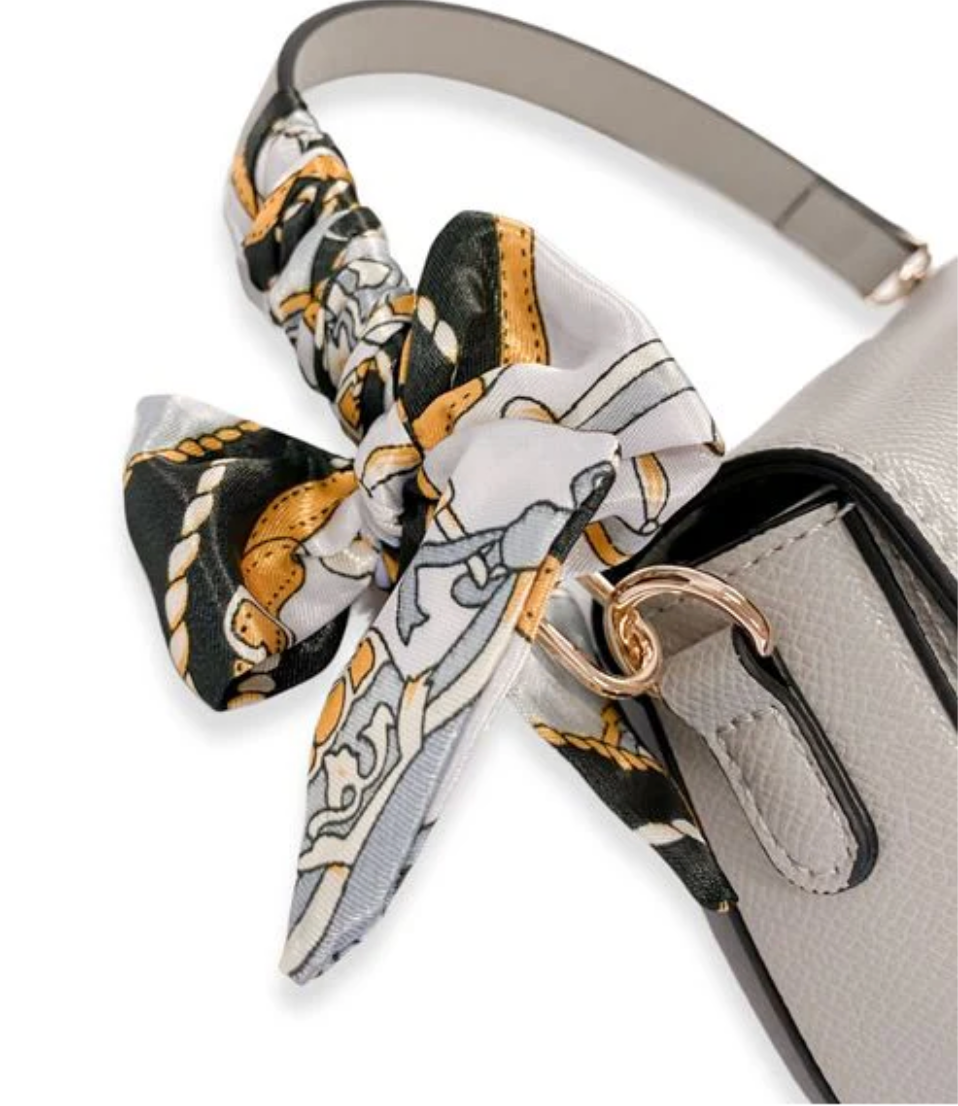 This classic saddle style is finished with a tied scarf and includes a detachable golden chain. The perfect purse for you to match with your mini me!