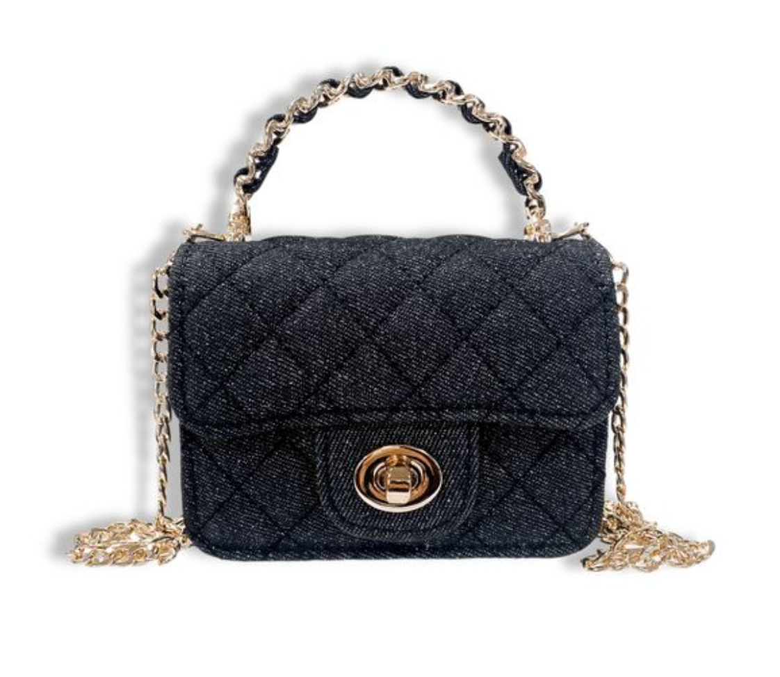 This chic denim purse will make a staple in your little ones fashion! The denim has a subtle glitter look to it. Available in 2 colors. Comes with a gold cross body chain.