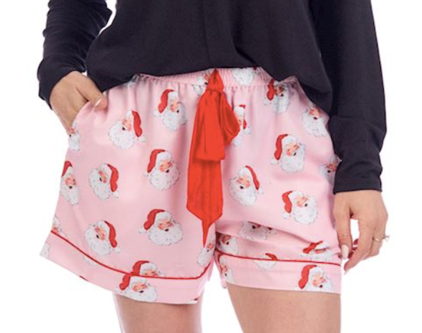Polyester pajama shorts feature bow tie at waist, piping detail and side pockets. Inseam measures approximately 3 3/4" on size small.