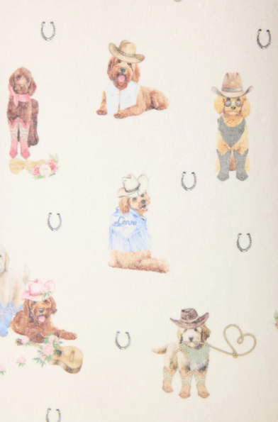 Round up some cozy charm. These ivory lounge pants—crafted from soft peachy jersey—feature a relaxed fit, drawstring waist, and an allover western dog print with cowboy hats, boots, guitars, horseshoes, and playful pups ready for the rodeo. Perfect for pairing with the matching top for a look that’s paws-itively adorable.