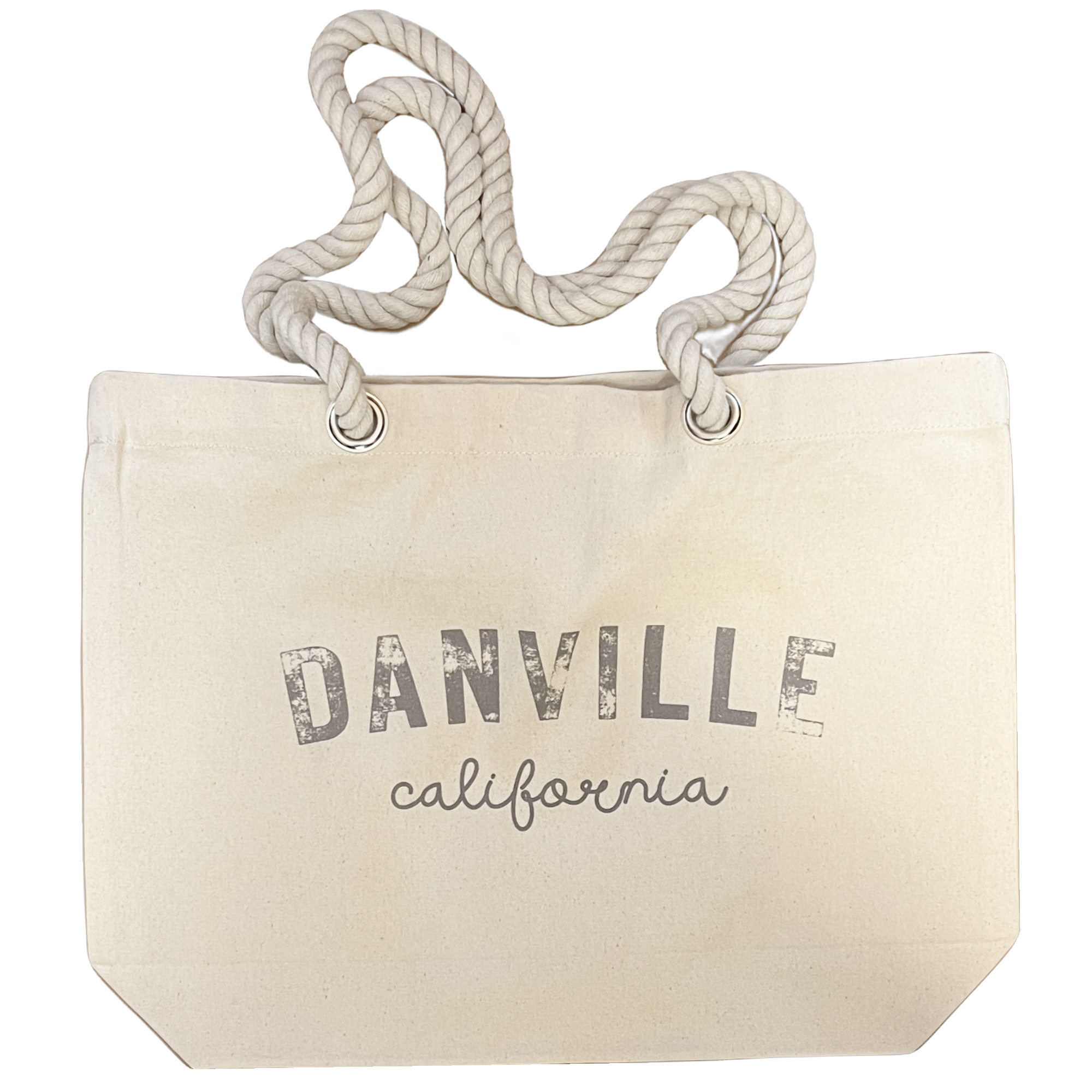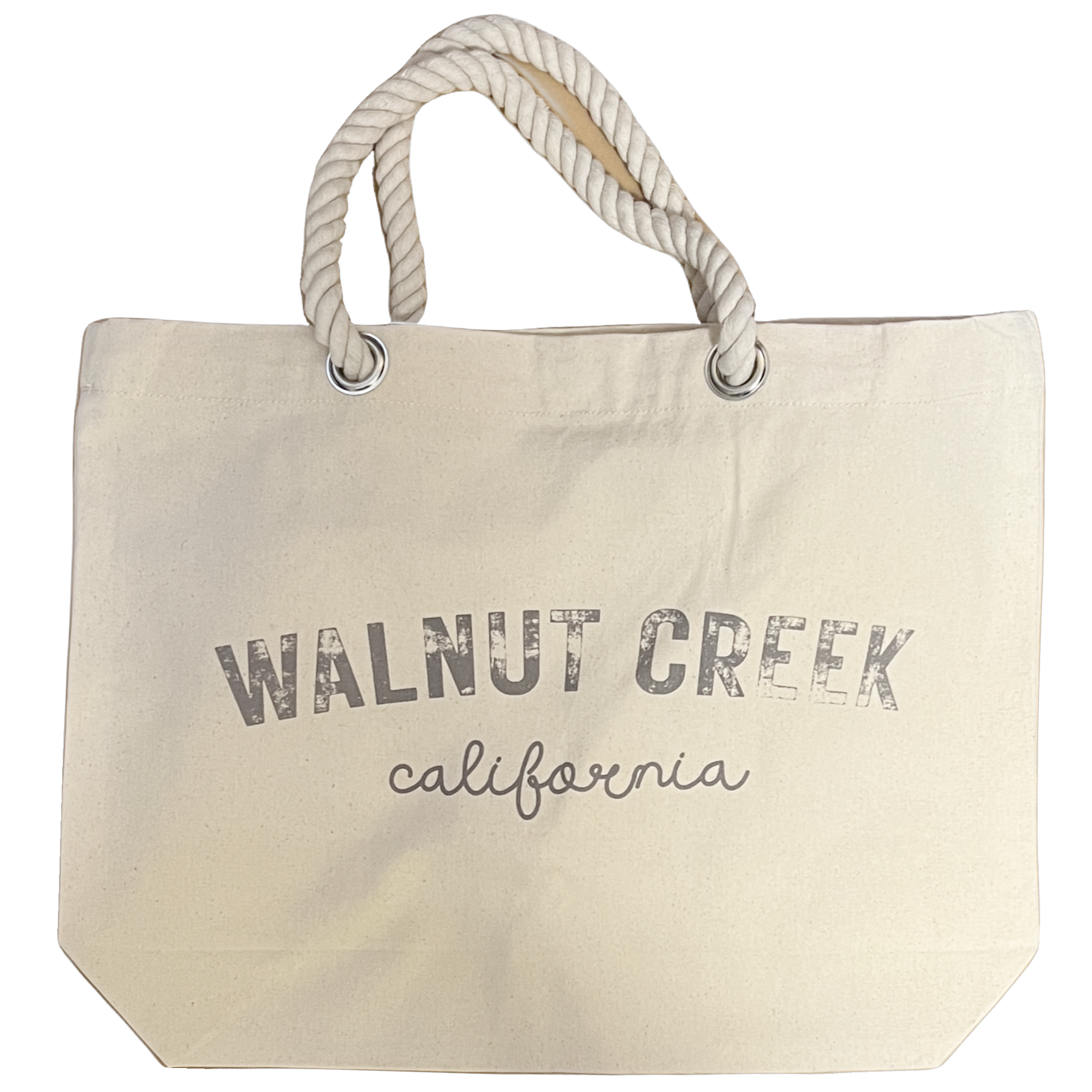 East Bay city names, Walnut Creek, Lafayette, Danville canvas tote beach bag with durable rope handles—perfect for beach days, shopping, or everyday use. The city name is in a distressed font, complemented by the state in an handwritten script style. These beach, lake and pool bags are perfect for so many things.  Canvas, 17"W x 13"H x 4"D